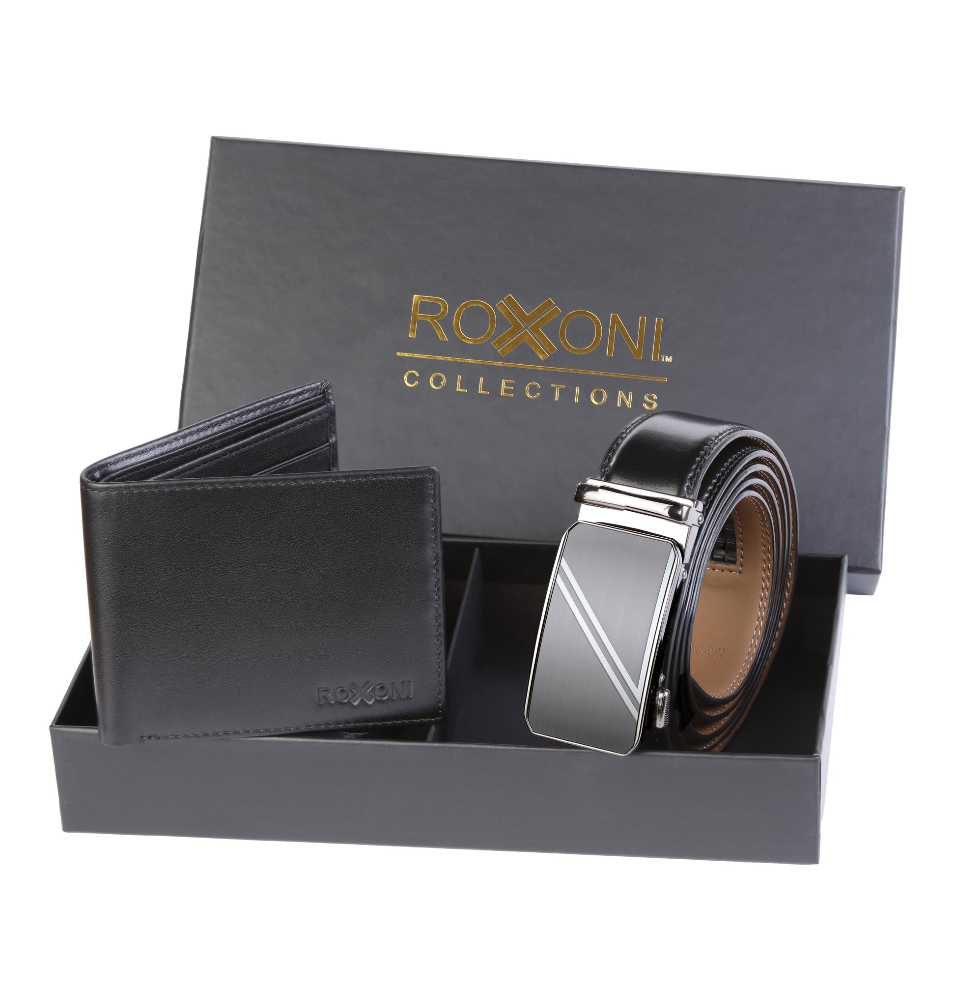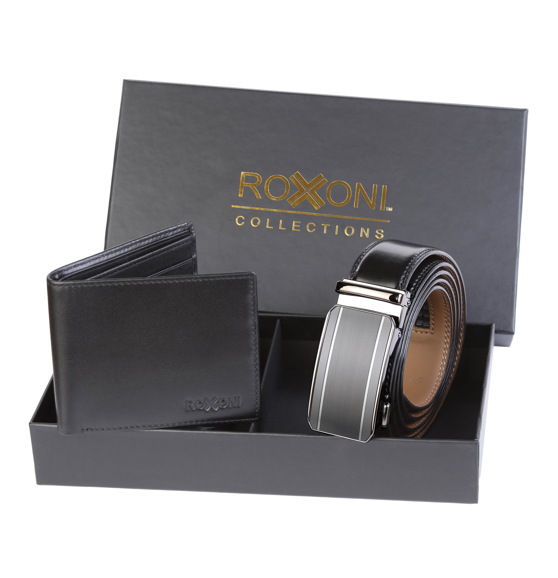 - [UNIQUE LEATHER BELT GIFT]: Help your man to upgrade his style, to chic and suave, with the Roxoni men's genuine leather belt and wallet gift. The rachet dress belt is sure to complement your every style, uplift your elegance, and make you stand out in a crowd.