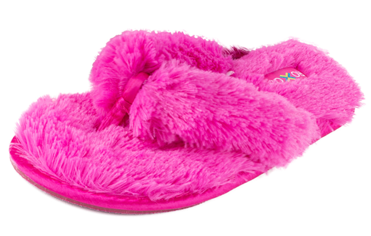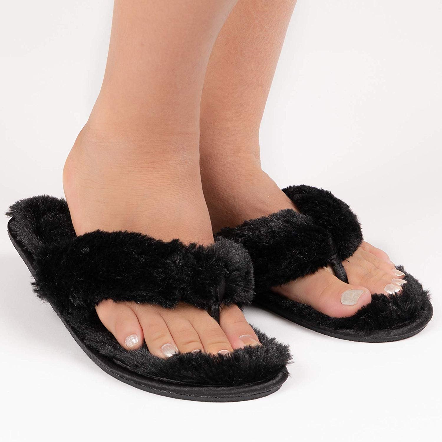 COMFORT DRIVEN DESIGN: Fall in love with these super soft and plush house slippers. The memory foam inner sole contours to the unique shape of your feet and the soft and water-absorbing material keep your feet relaxed and cool. The slip-on design of spa slippers makes wearing and removal a breeze. NOT JUST FOR HOME: These chic furry slippers for women are too stylish to wear just at home. Wear spa flip flops while lounging in a resort, going on a quick grocery shopping or for a small walk around the city. Furry slippers can perfectly match with your pajamas, loungewear and every other robe. DURABLE RUBBER SOLE: The durable and practical rubber sole of fuzzy slide slippers allows you to take confident and steadier steps every time you walk. Thanks to the non-slip profile of the sole, you can wear comfy fuzzy slippers indoors or outdoors without the fear of accidental slips and skids. MACHINE WASHABLE: You can easily remove the dirt and stains by putting the cozy house slippers directly in the washing machine. Made from premium quality materials, fluffy slippers are durable enough to survive multiple machine washes without fading. Faux Fur, Rubber Sole Thong Style Colors: Black, Grey, Green & Pink Sizes: 6-7,7.5-8,8.5-9,9-10,10.5-11.5