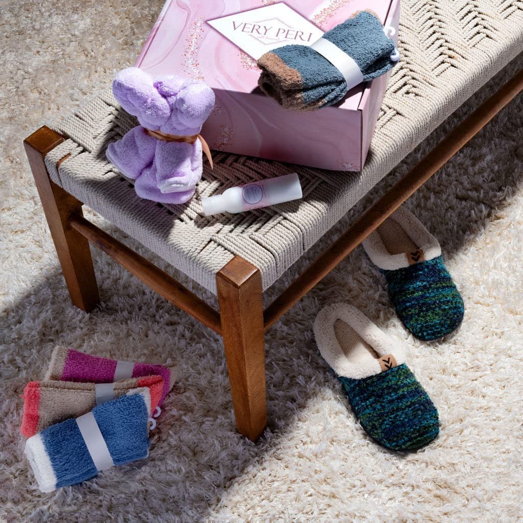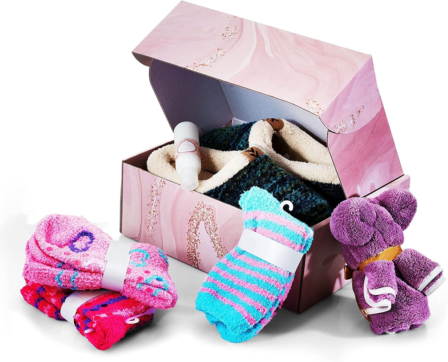 - [SPECIALLY CURATED BOX FOR HER] – Filled with exciting presents, this womens pamper gift box contains 1pair of comfy home slippers, 6 pairs of colorful socks, 1 plush towel, 1 body lotion, and 1 gift message card to add a personalized touch.